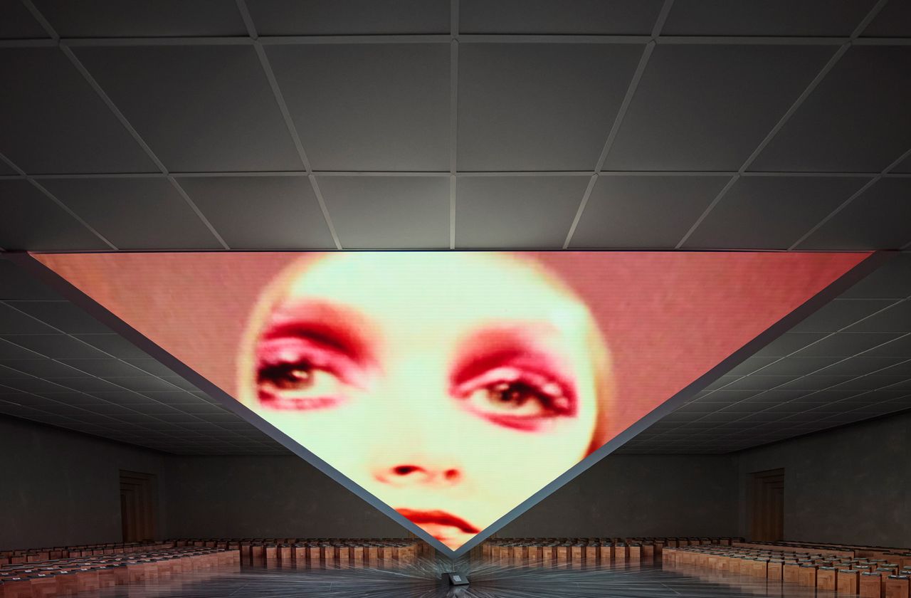 쇼의 중심에는 역설적인 피라미드 형태가 자리잡고 있으며, 이는 아담 커티스의 영화를 상영하는 다이아몬드 역할을 합니다. 앤더슨과 스테파노 바이지는 이 건축적 감각을 공간에 불어넣기 위해 피라미드를 장식으로만 사용하지 않고, 디올의 새로운 시대를 여는 상징으로 활용했습니다. 커티스의 영화는 아카이브 영상과 그의 독특한 에클레틱함을 혼합하여, 디올의 역사와 공포 영화의 단편을 대비시키며 긴장감을 유지합니다.