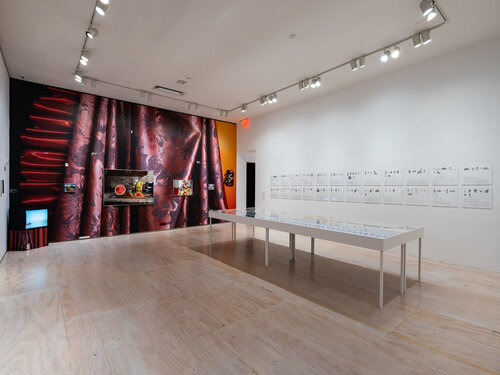 Farah Al Qasimi는 1991년 아부다비에서 태어나 'Greater New York' 전시에서 두 벽을 가로지르는 사진 작품을 선보인다. 한 벽은 빨간 커튼이 패턴으로 된 벽지로, 다른 벽은 나무 도마 위에 놓인 수박을 담은 사진으로 구성되어 있다. 수박의 살이 관객을 바라보며, 배경에는 노란 옥수수 기름 병과 꽃이 담긴 화분이 있다. Al Qasimi의 작품은 미시간 디어본의 아랍 커뮤니티와 그녀가 성장한 아랍에미리트를 기록하는 대규모 프로젝트의 일환으로, 다양한 장면을 통해 풍부한 다중성을 창출한다.